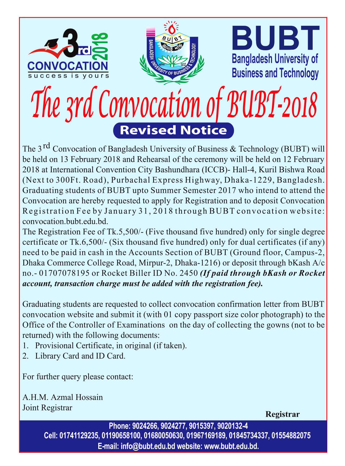 One Stop Service Center: 01810033740 (for BUBT current students)