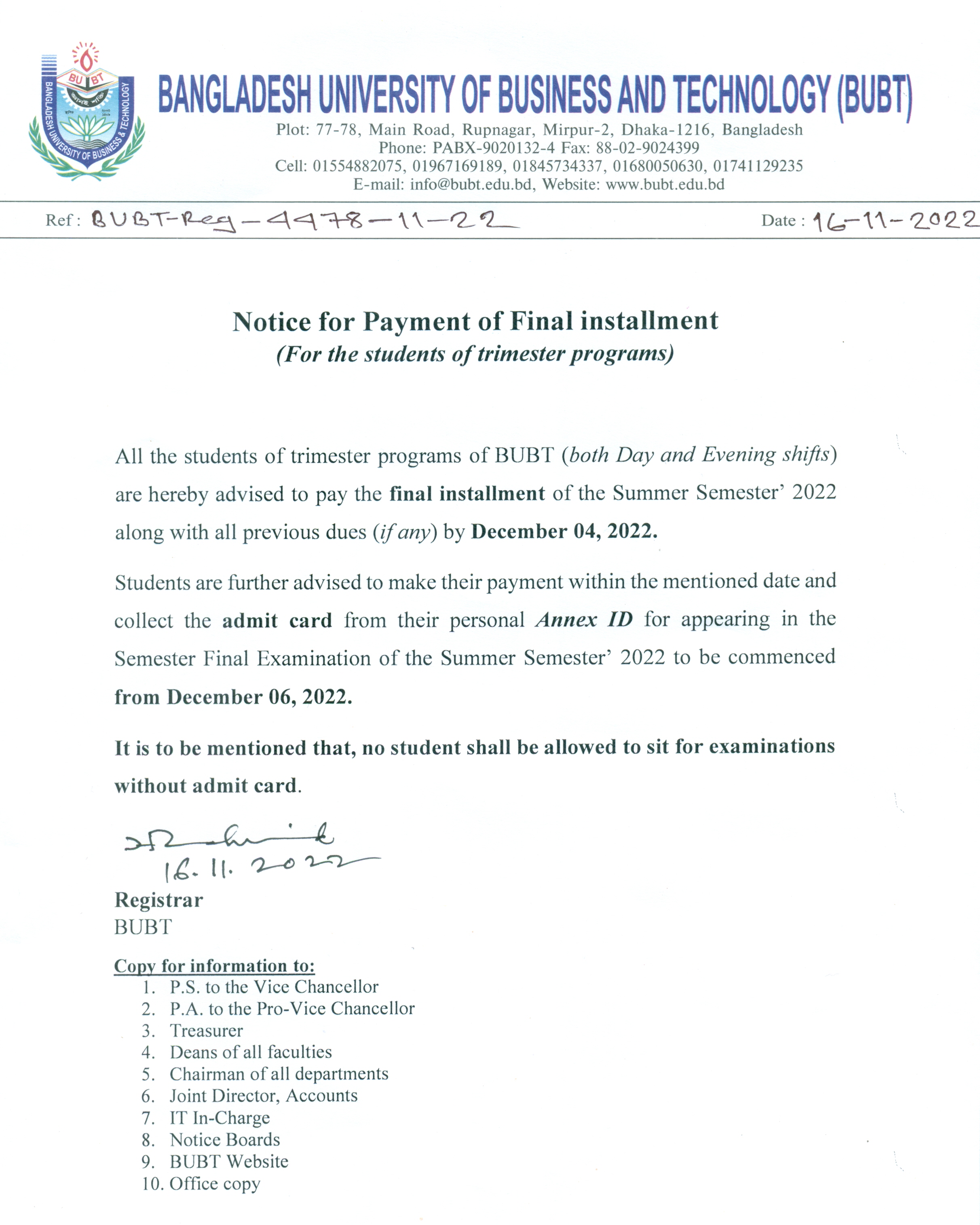 One Stop Service Center: 01810033740 (for BUBT current students)